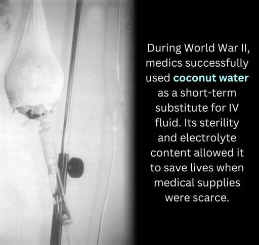 Yeah it’s actually a really shitty substitute for blood, it’s just slightly less shitty than dying. It was all about keeping the blood pressure high enough so that what little blood you had would work. Coconut water was one of the only things that could do that without also killing you. It’s still a very bad day